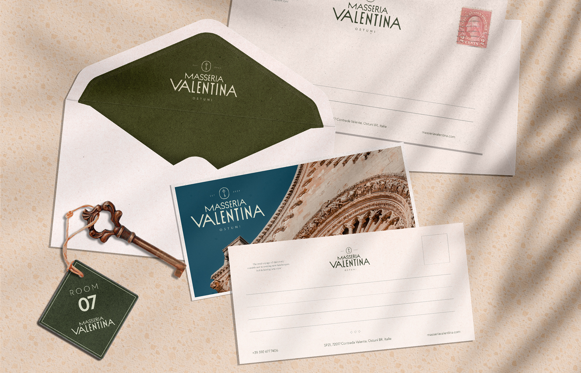 Entouré d’oliviers, véritables symboles de la région des Pouilles et de l’Italie, le vert olive était la couleur idéale pour représenter l’hôtel. Le beige, rappelant les pierres vieillies par le temps de la ferme, instaure une atmosphère de sérénité tout en insufflant une image haut de gamme.